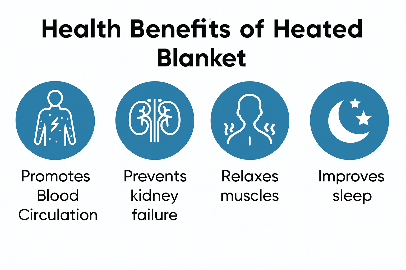 Health Benefits - A heated blanket can relieve muscle and joint pain, the heat improves blood circulation and helps relax tense muscles. Heat has a calming effect and can improve well-being by reducing stress. a constant, pleasant temperature can help maintain comfort during sleep and prevent waking up due to cold